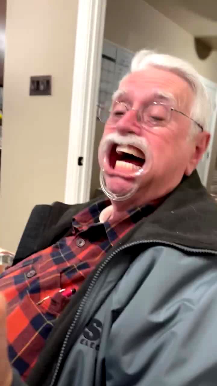 Action at 00:35. A woman places a lip retractor in a senior man's mouth and he and his off-camera family play Speak-Out sand he laughs and his teeth fall out in the kitchen.