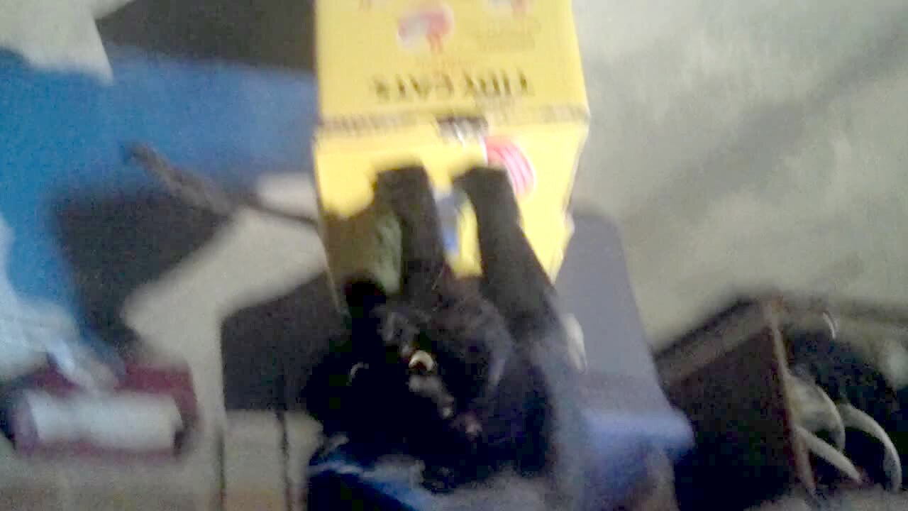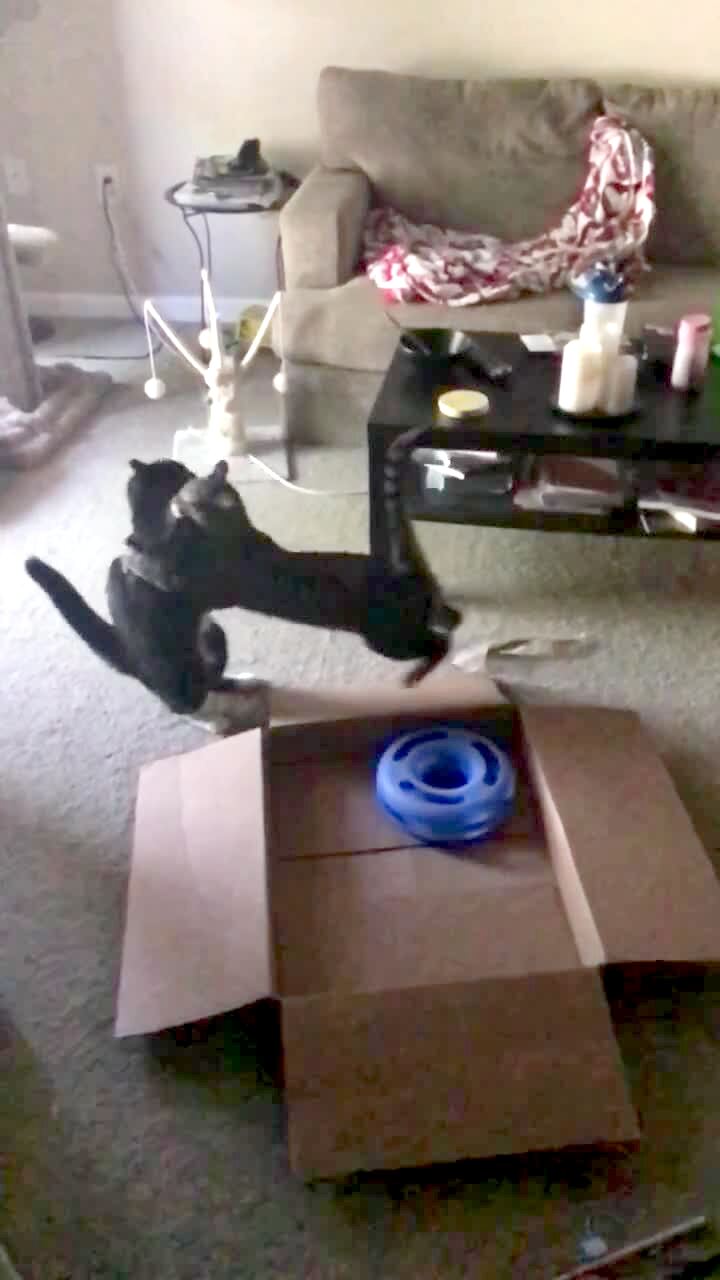 A cat stands on top of a box indoors trapping another cat in it. Action at :40.