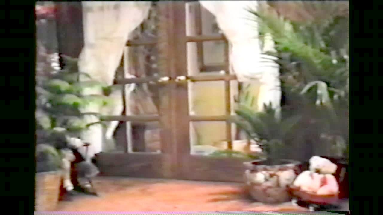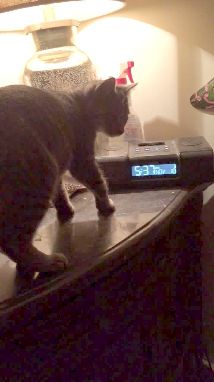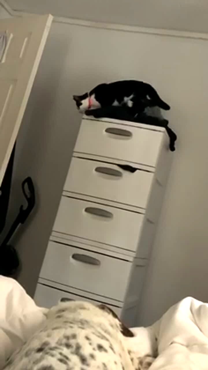 A cat in a bedroom jumps from a shelf onto the top of a door. A woman laughs and curses. The cat then does the splits between the door and the door frame.