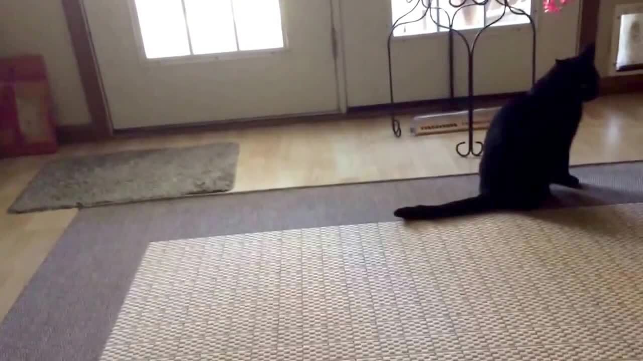 Two cats in the house one backs in to the door stopper and is surprised by it and jumps. It scares the other cat.