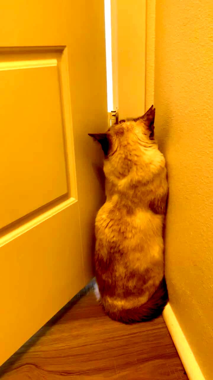 A cat hides up against the corner of a wall as another cat lurks on the other side. A woman tells the cat to come out, and that the other cat won't get it, and the cat turns around and looks at her over its shoulder.