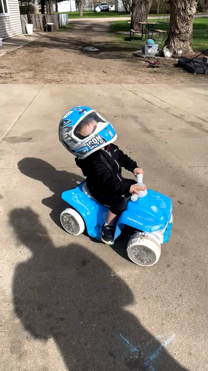 A young boy with an adult helmet on jerks back and forth while he rides on a motorized four-wheeler then falls off onto the ground.