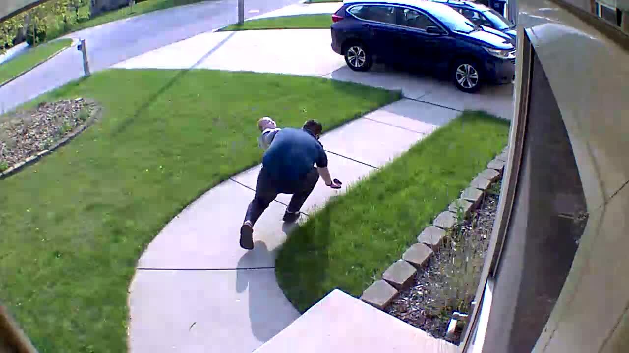 A man trips and tumbles to the sidewalk as he steps off of the front porch while he holds his baby. He manages to keep the child from hitting the ground. Security footage.
