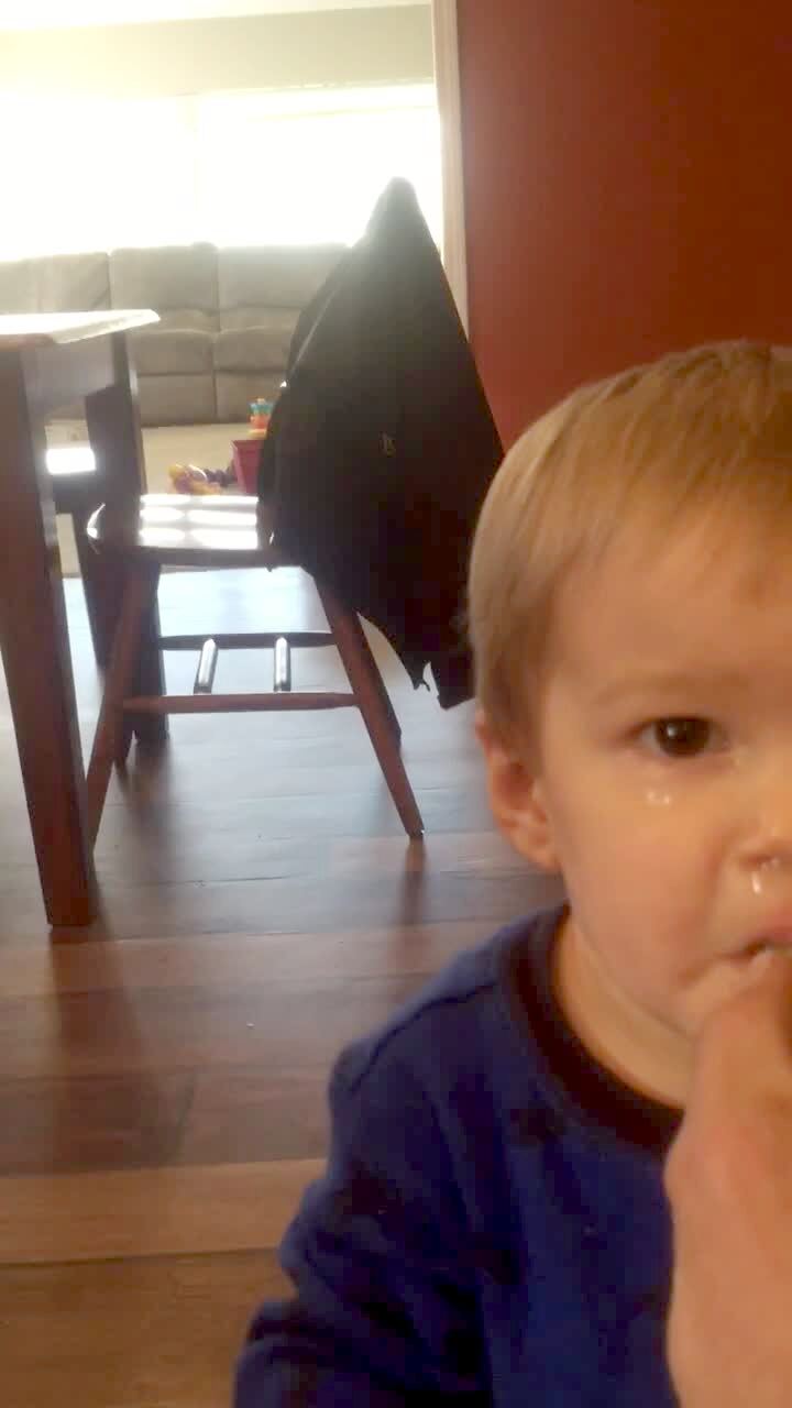 A young boy in a kitchen reads a yogurt label and says the amount of cholesterol is "oh my god." The woman with the camera says it's 0 milligrams (0mg).