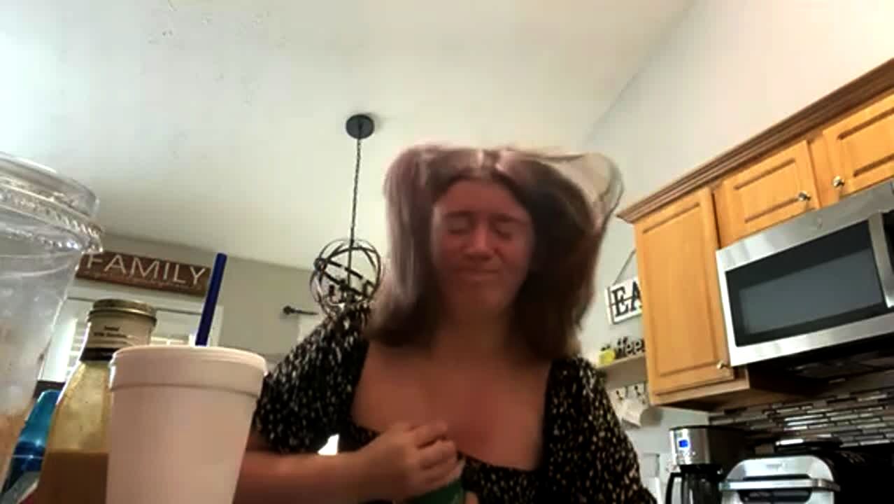 A teen girl struggles to open a Thermos of old coffee with spoiled milk. The bottled up pressure causes it to explode on her. She starts to gag and scream as she wipes it off her chest and clothing.