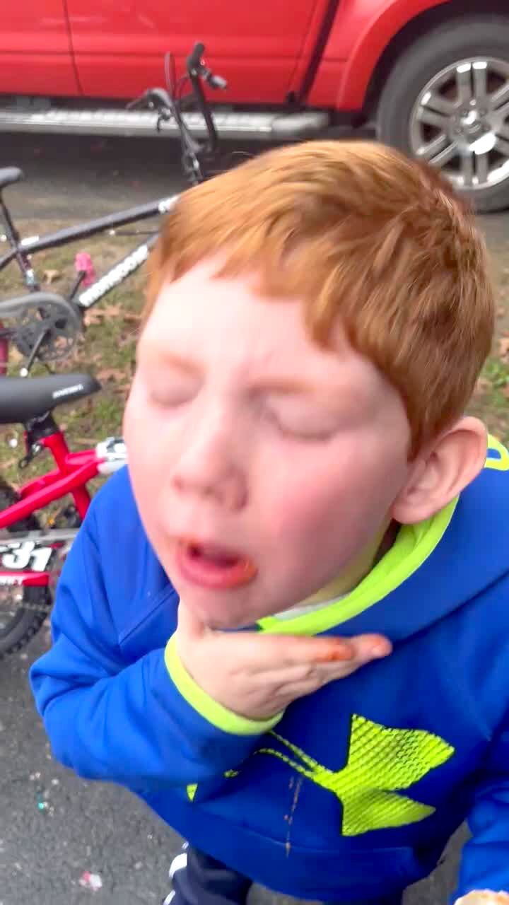 A young boy eats an oyster in the backyard as the man behind the camera encourages him. The young boy struggles to keep the oyster down but eats it and winces.