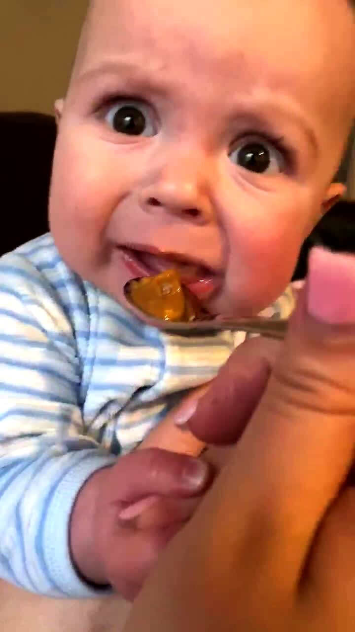 A baby boy tries baby food for the first time in a living room and cringes and widens his eyes.