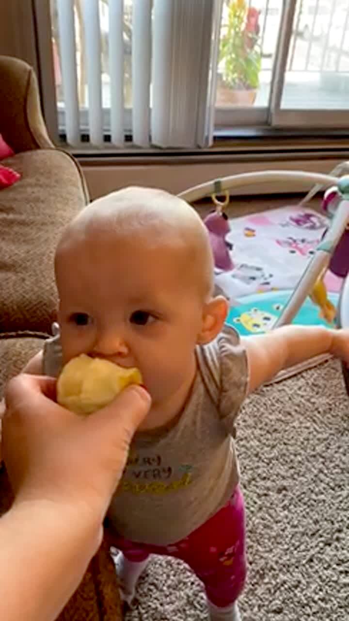 A baby girl makes a sour face when she bites into an apple then falls over in the living room.