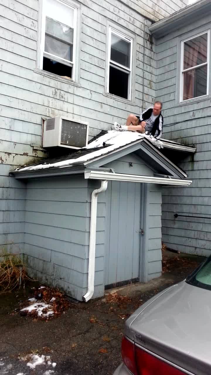 A man climbs a ladder with a shovel and the ladder slips from the roof and he falls in the snowy driveway. Home Improvement.
