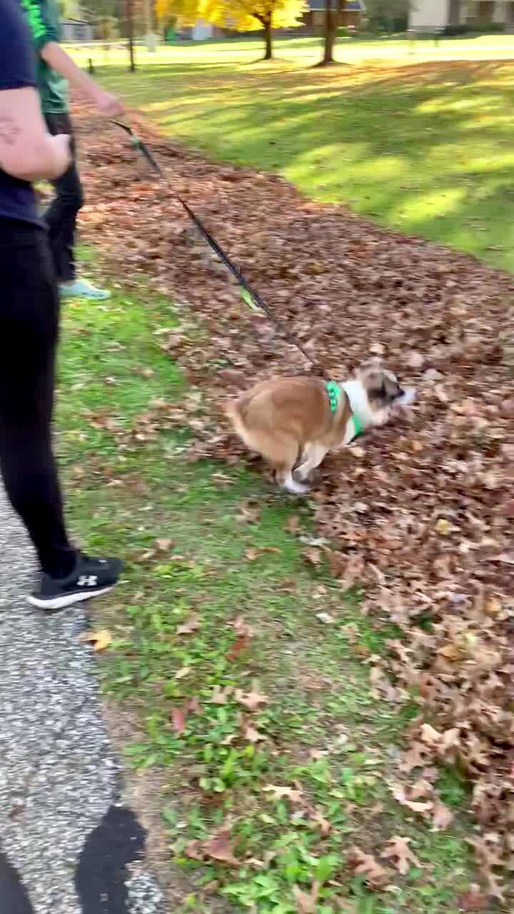 A dog is encouraged by his family to run and jump into a pile of leaves. He disappears in the pile then reemerges and dives back into the pile again as they laugh.