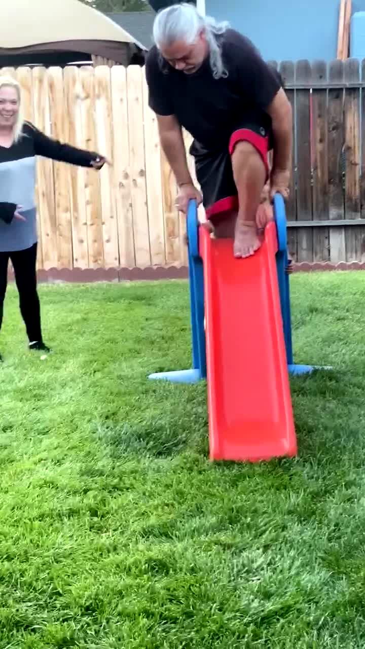 A senior man attempts to slide down a small plastic slide outside in a backyard. He falls down and does the splits and hurts his groin. Then a tot girl slides down the slide.