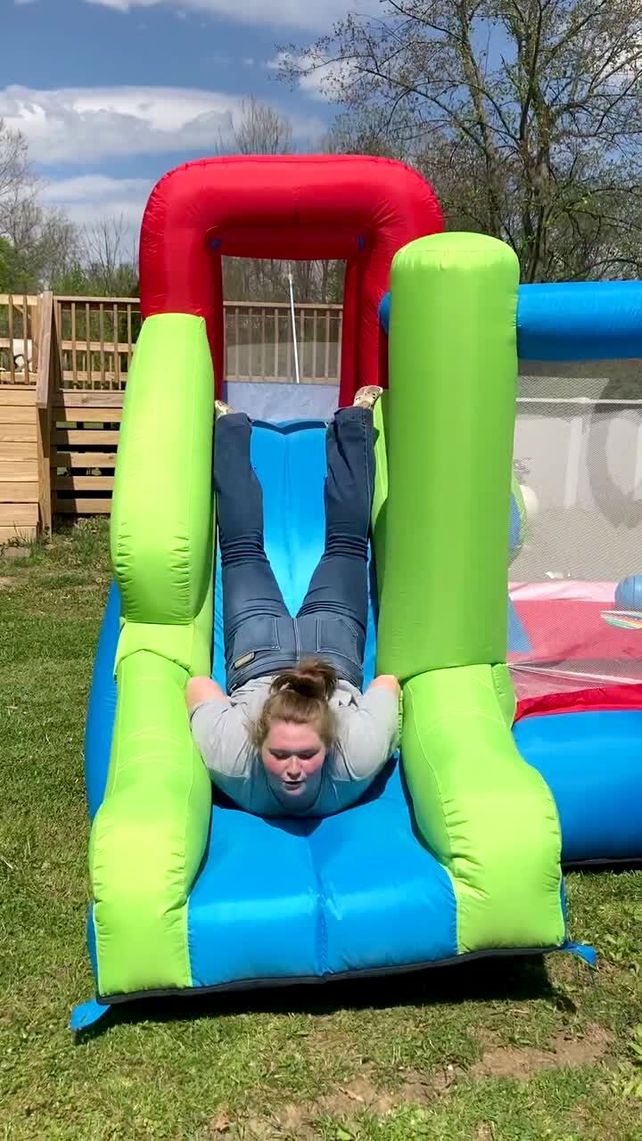 A woman goes down a small inflatable slide and scorpions into the ground. When she looks up she has a mouth full of grass.