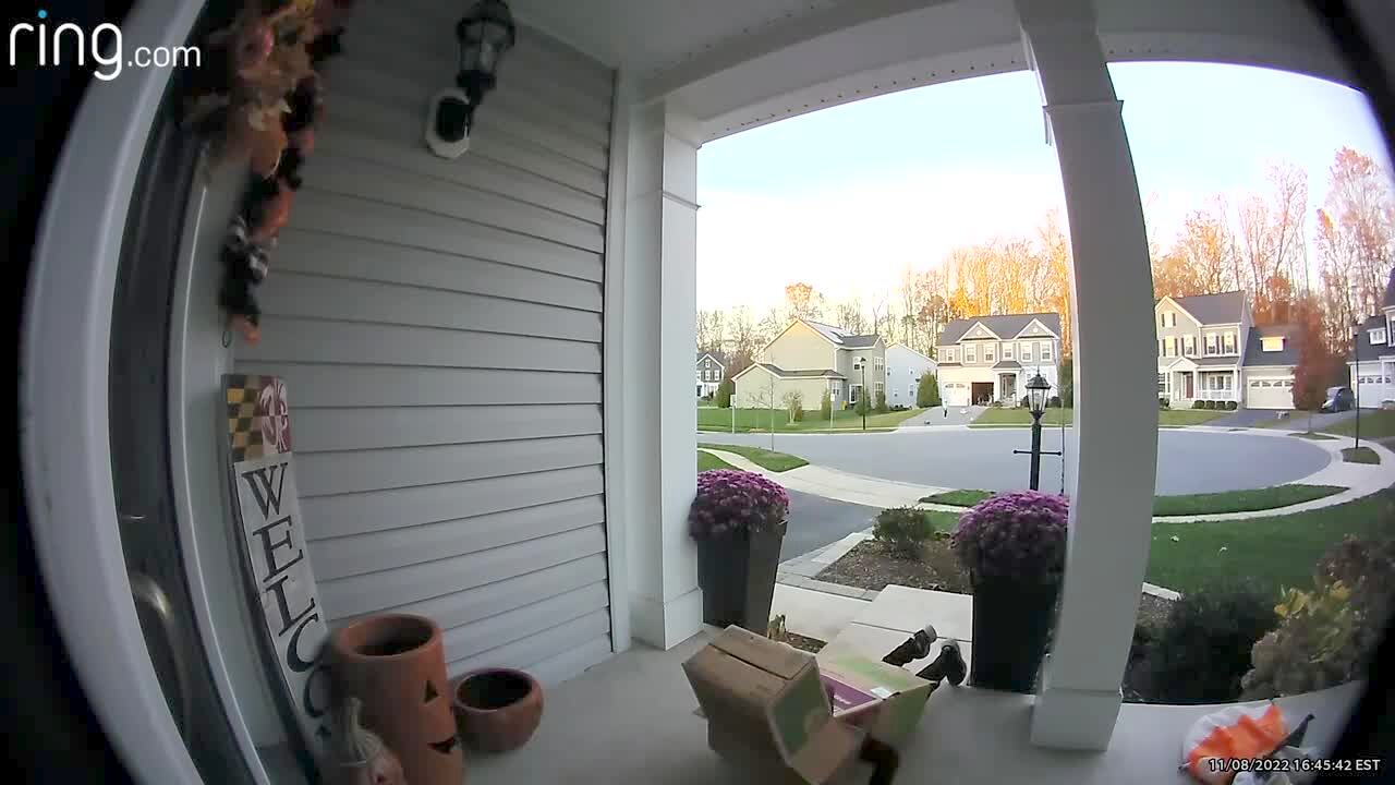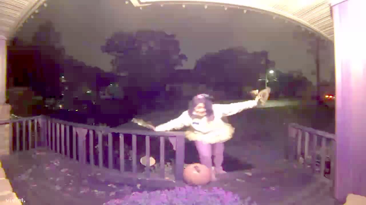 A woman runs up a flight of porch stairs while she is dressed in a cupcake Halloween costume, then she trips and falls and knocks several pumpkins off of the stairs. Security footage.