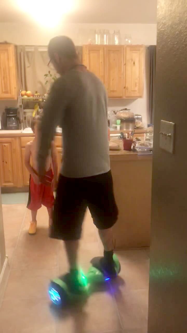 A man spins on a hoverboard in the kitchen, and loses his slippers when he falls off of it. The hoverboard hits the wall, and a whiteboard falls onto a young boy's head.