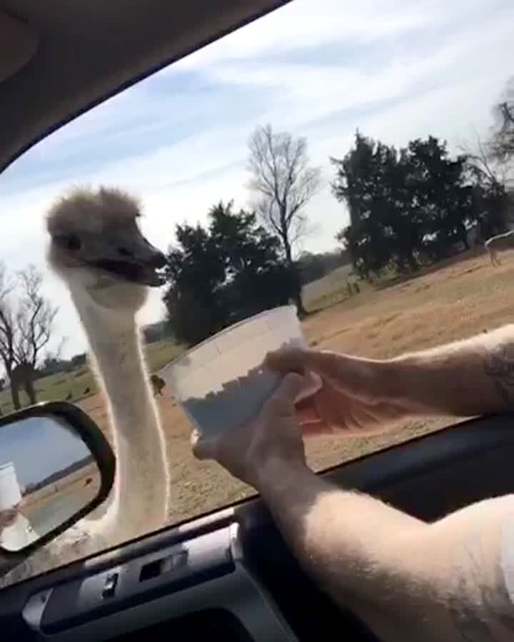 A man holds his hand out of a car and feeds an emu some pellets. The man says, "Ow!" each time the emu pecks at his hand. The ostrich then goes to teh front window and pokes his head in but a woman screams as she asks someone to close the window. A young boy asks her to stop because he can't see the emu.