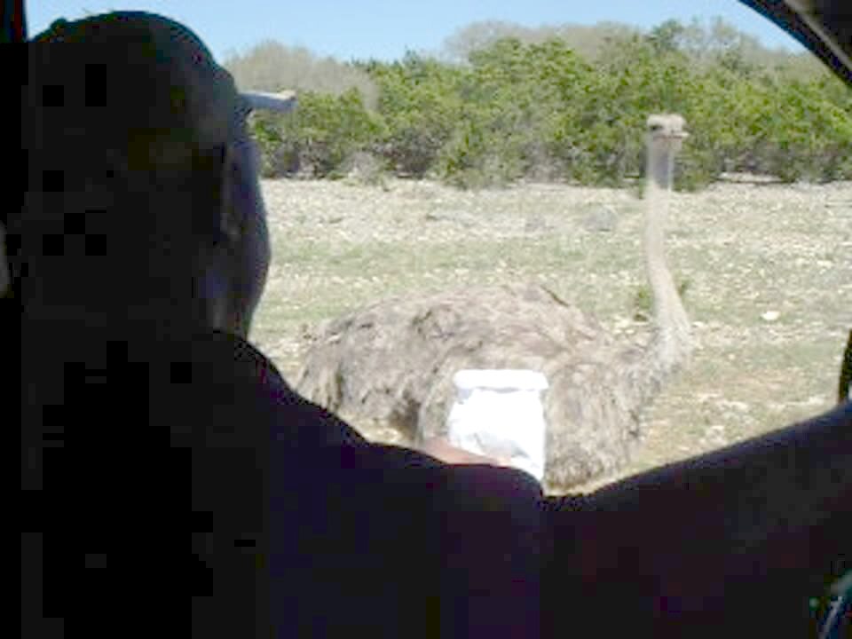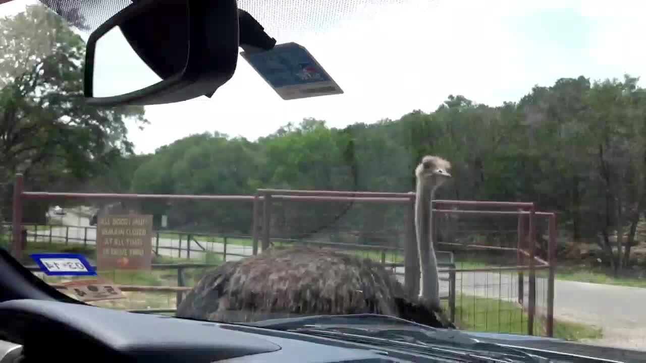 Ostrich walks down the road towards a car eats the plastic ball off the antenna. The ball can be seen inside the bird's neck. Teen girl laughs in the front seat. Drive through safari zoo.