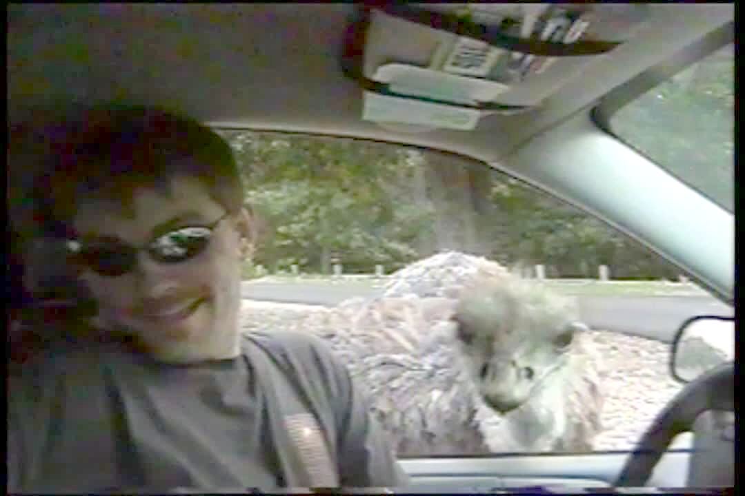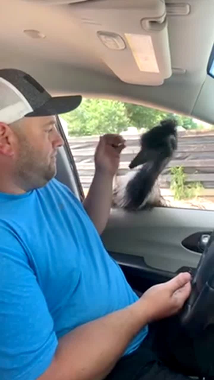 Man feeds an ostrich from his car at drive-through safari. Ostrich pecks / hits him in the head with its beak. Zoo. Bird.