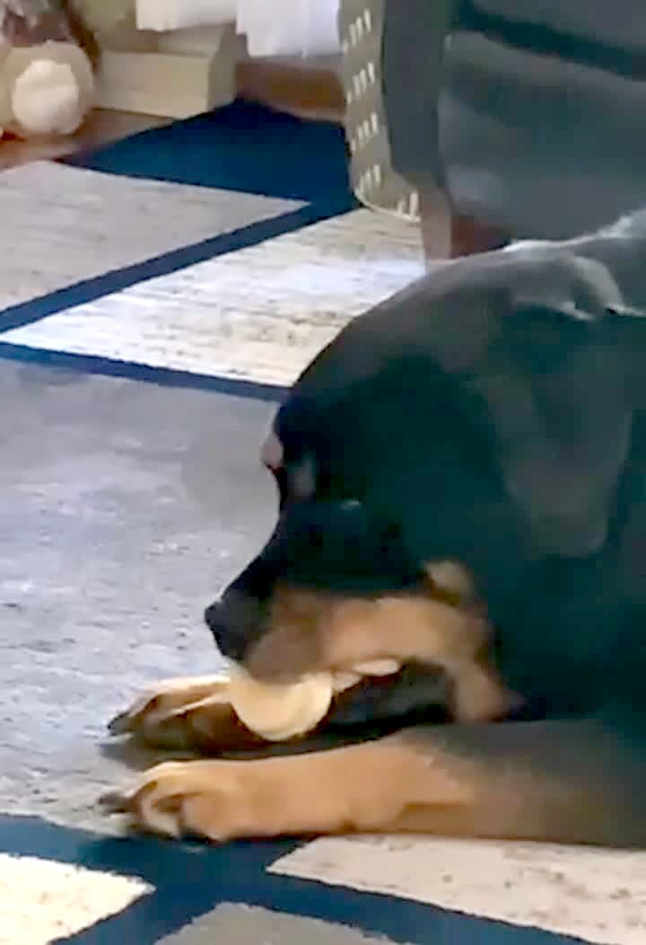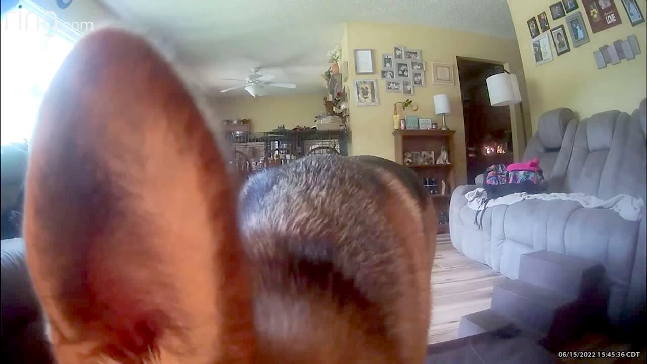 A German Shepherd walks up to the security camera and tilts his head when he hears voices. TikTok. Security footage.