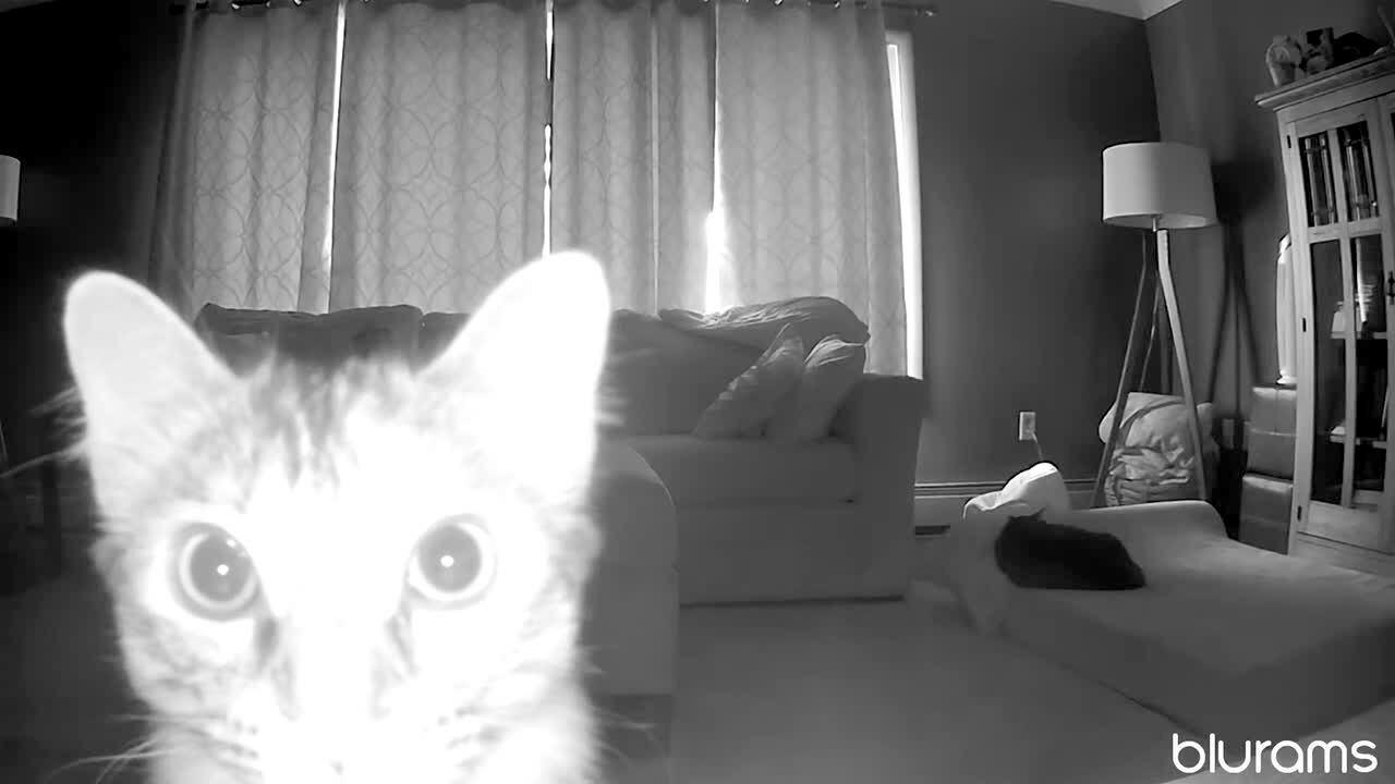 A cat stands up in front of a security camera and paws at it in a living room. Security footage.