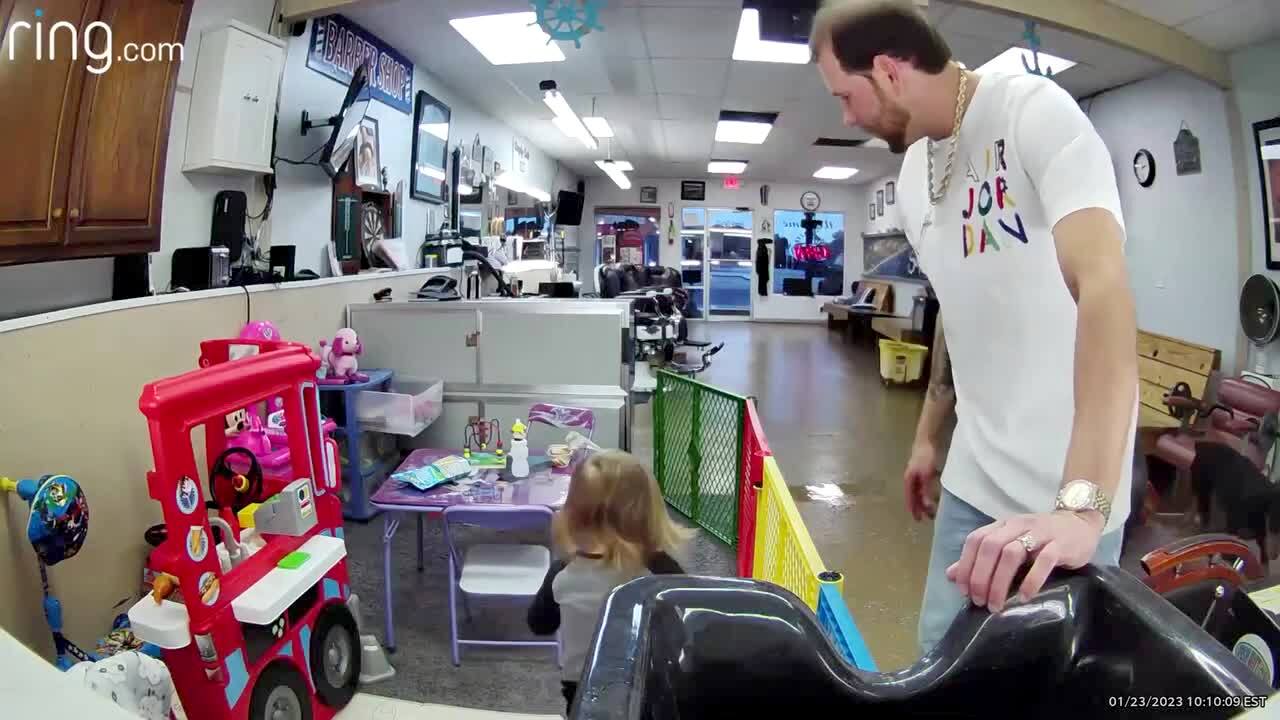 A tot girl is in a barbershop. She takes the hose that washes people's hair and sprays water all over the floor. A man runs to her and turns it off. Security Camera