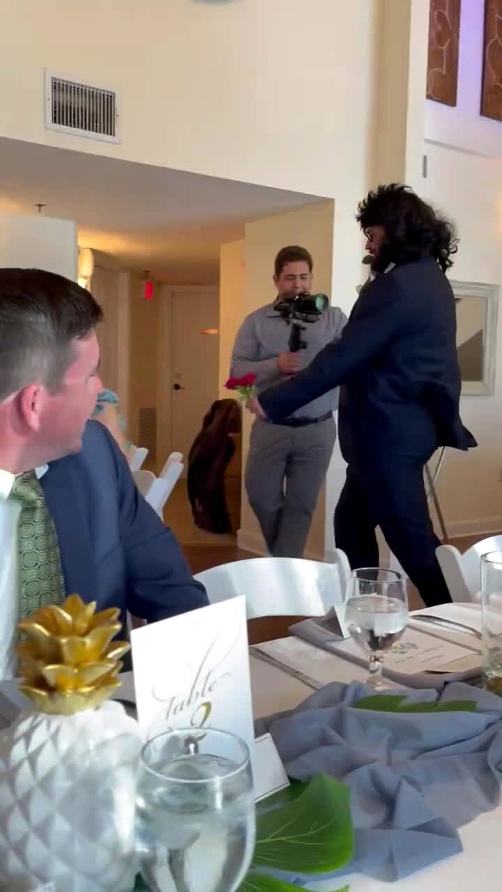 A best man dances through a wedding reception, tossing flower petals. Then he squats down and his pants rip.