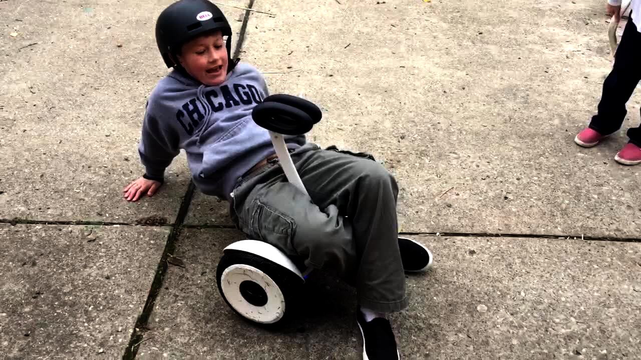 A man rides a young boy's scooter in a driveway and yells, "trick shot," when the boy tosses a ball right in front of him, and the man wipes out. Security footage.