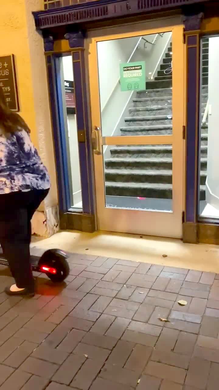 A woman drives an electric scooter on a sidewalk and misses her step and then falls into a business sign.