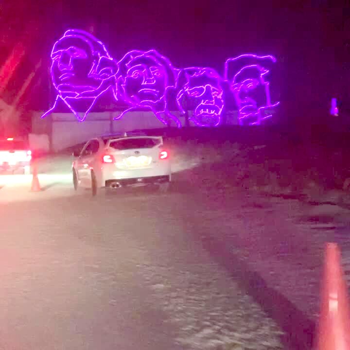 A young boy shouts, "The Beatles," as a family drives through a holiday light festival and comes upon an outline of Mount Rushmore.