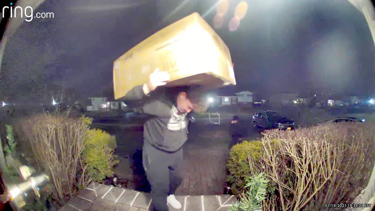 A man opens the front door while holding a package box on his back. Then the package falls, knocking the man's father onto the ground. Security footage.