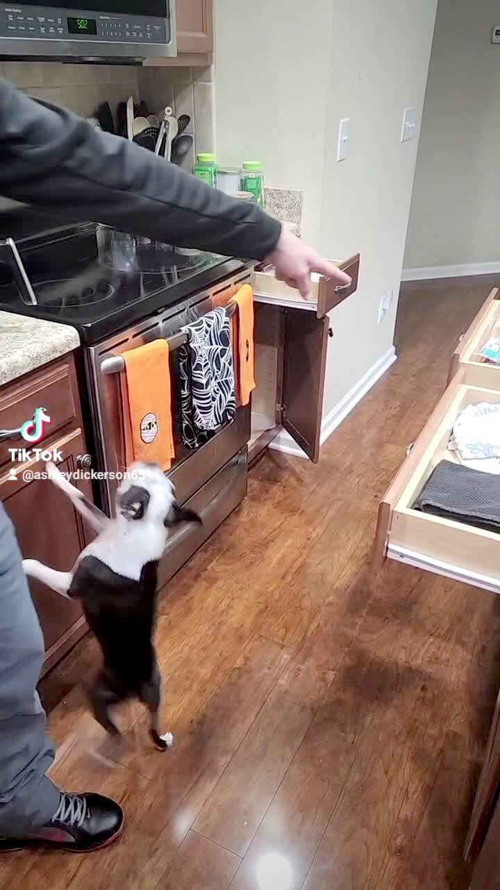 A man in a kitchen says he left the drawers open. A dog runs into the kitchen and closes all the drawers. TikTok Social Media Video.