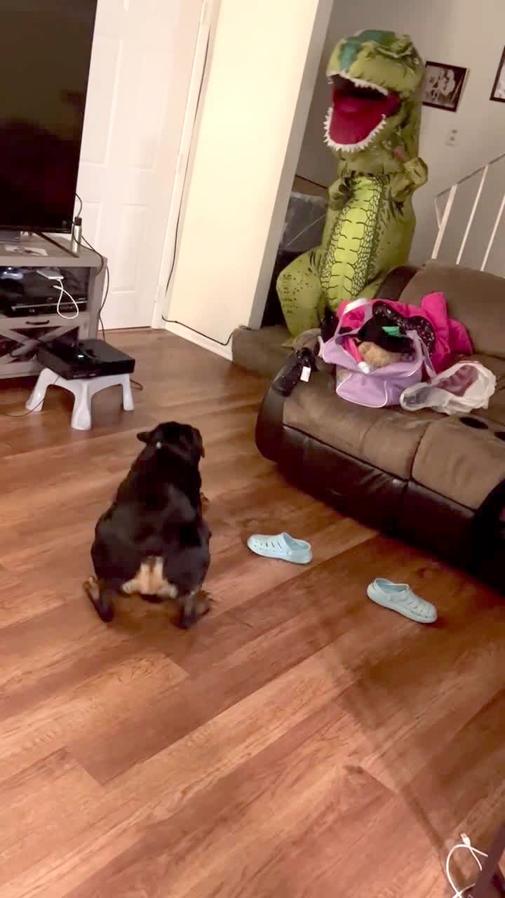 A young boy in an inflatable dinosaur costume stands in the living room and stares at a dog. The dog barks, the young boy takes a step forward and the dog jumps back. The young boy runs at the dog and the dog skittishly retreats.