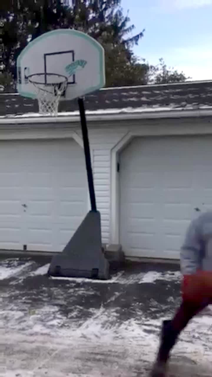 A teen boy runs and slides on winter snow and ice in the driveway and throws a basketball over his shoulders and it goes into a hoop.