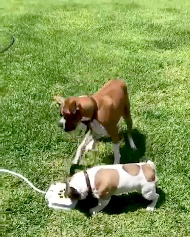 A dog catches water in his mouth in the backyard while a bulldog dog pushes a foot switch that shoots the water in to the air.