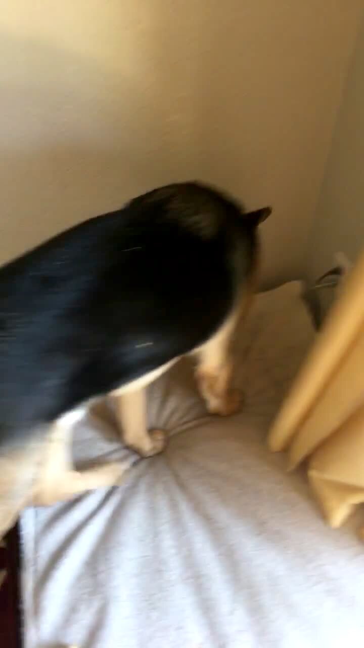 A German Shepherd dog spits a bagel out of its mouth on a dog bed after a woman asks it what's in its mouth.