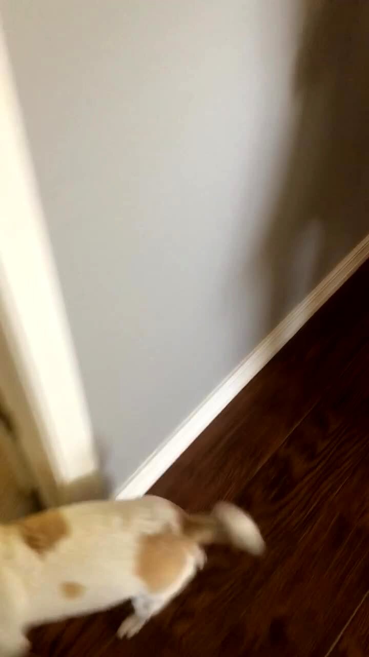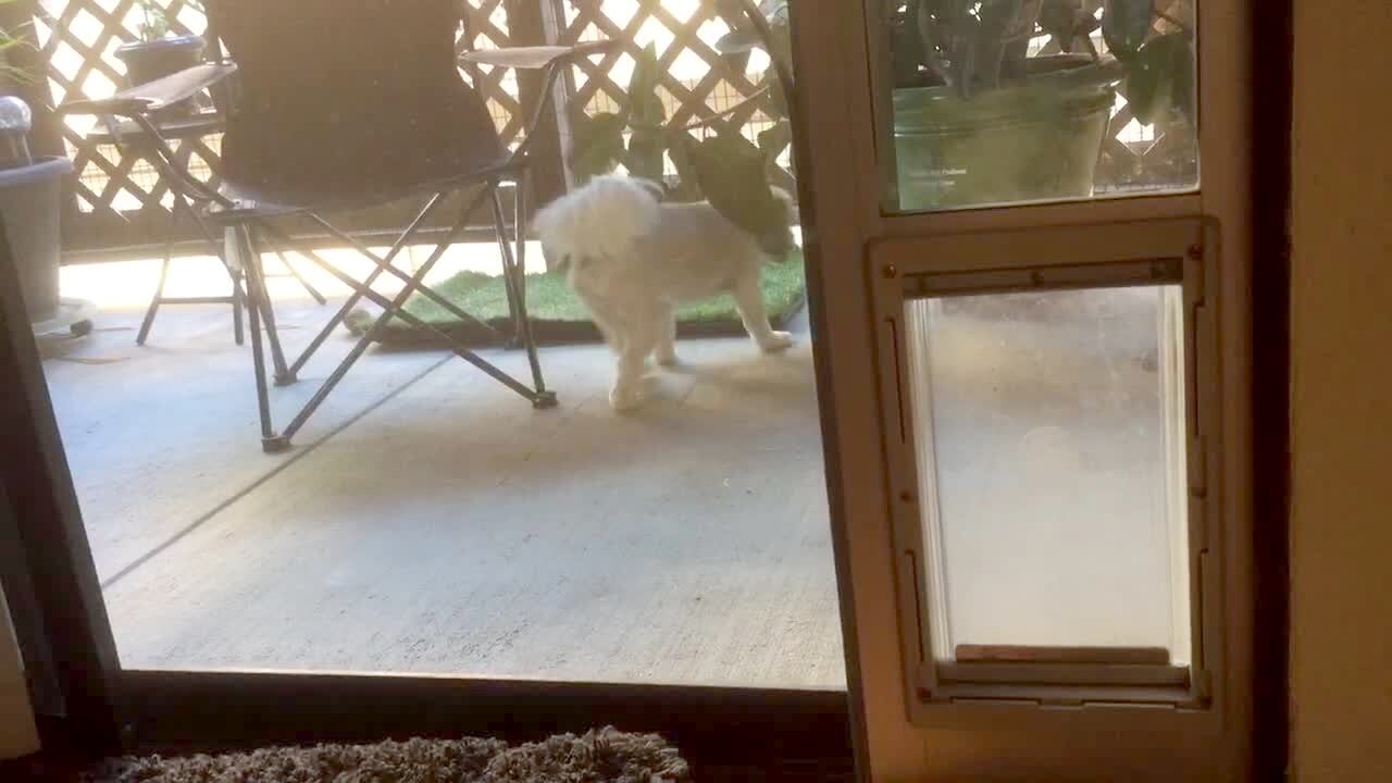A small dog opens the patio door with his nose and walks in to the living room after another small dog walks through the pet door next to him.
