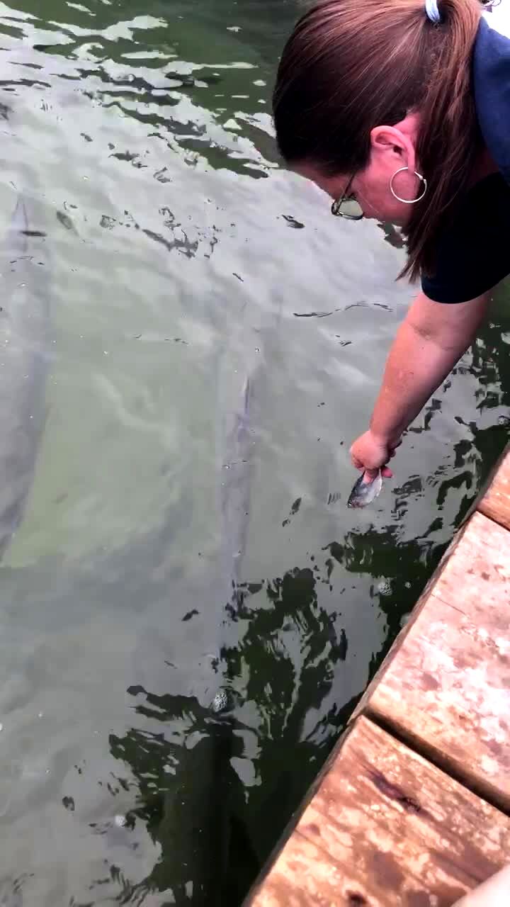 A woman screams when a large fish jumps out of the water and grabs a dead fish out of her hand while she lies on a dock.