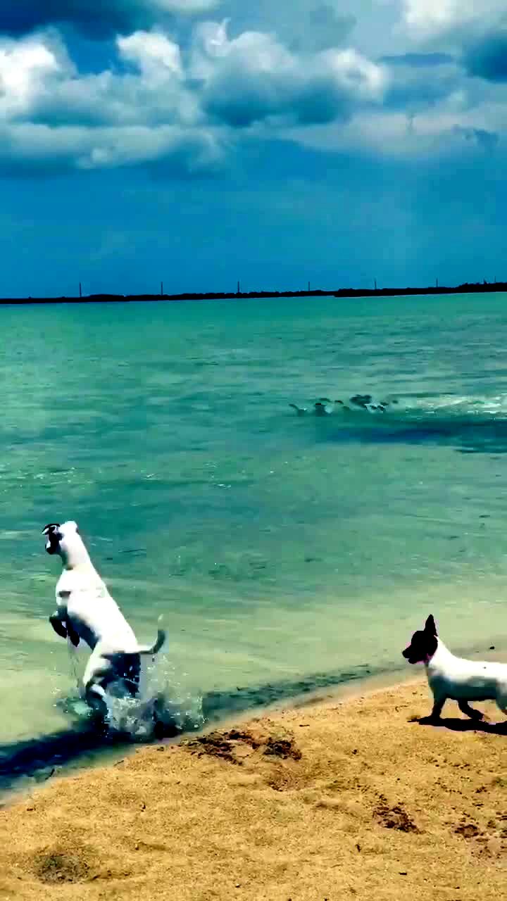 A dog runs out of the water at the beach when a school of fish get close to her as they jump out of the water.