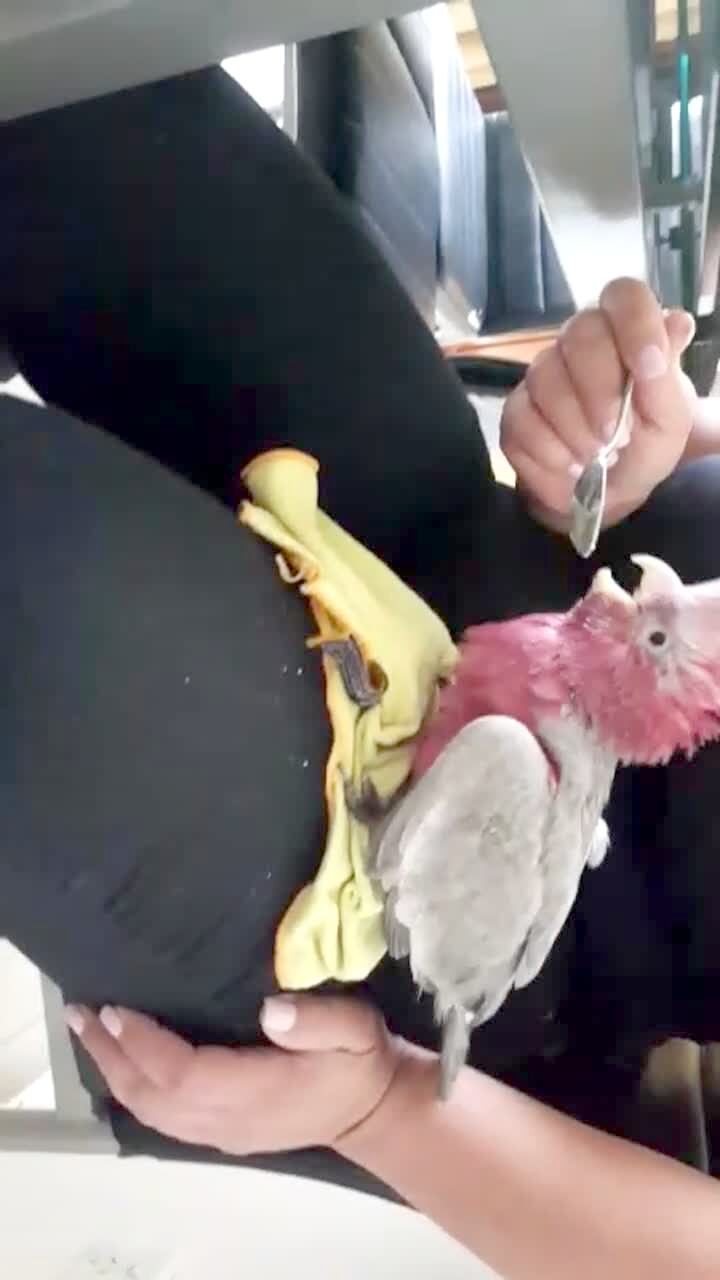 A bird makes a squawk noise while a woman feeds it with a spoon.