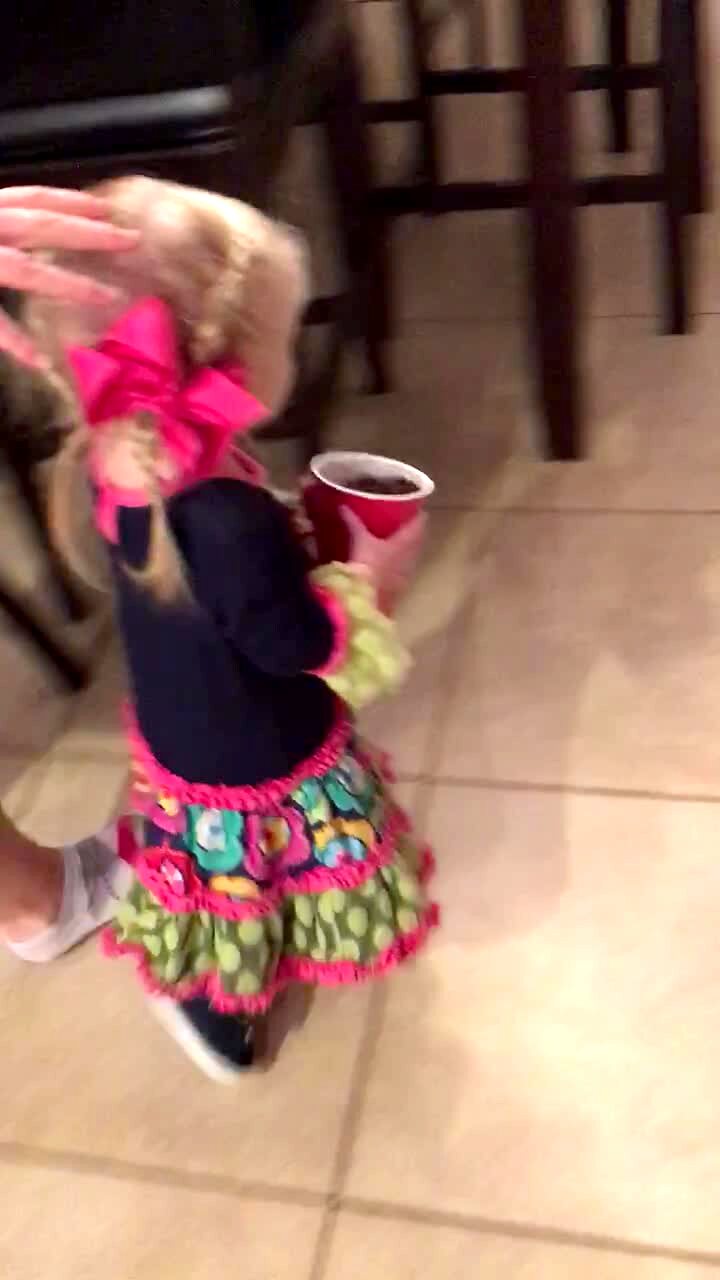 A tot girl carries a cup of dog food across the kitchen to the dog's bowl and pours it out, but the food spills on the floor instead of go in the bowl and then the dog comes over and eats it.