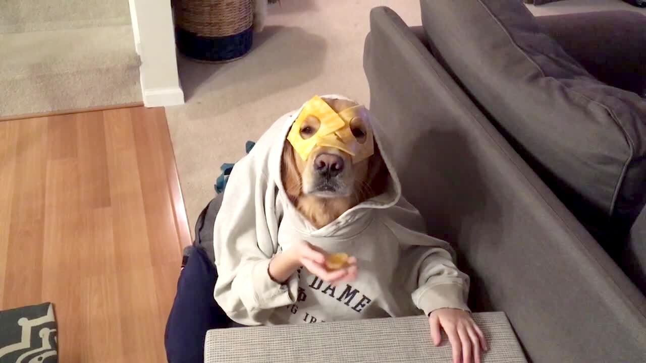 A dog with human hands wears a mask of cheese on his face. He patiently ignores the mask of cheese until his owner says "get it!"