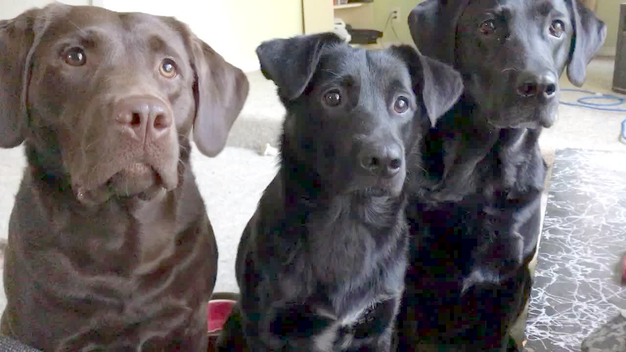 Three dogs watch a woman eat food and their heads go up and down in synchronization.