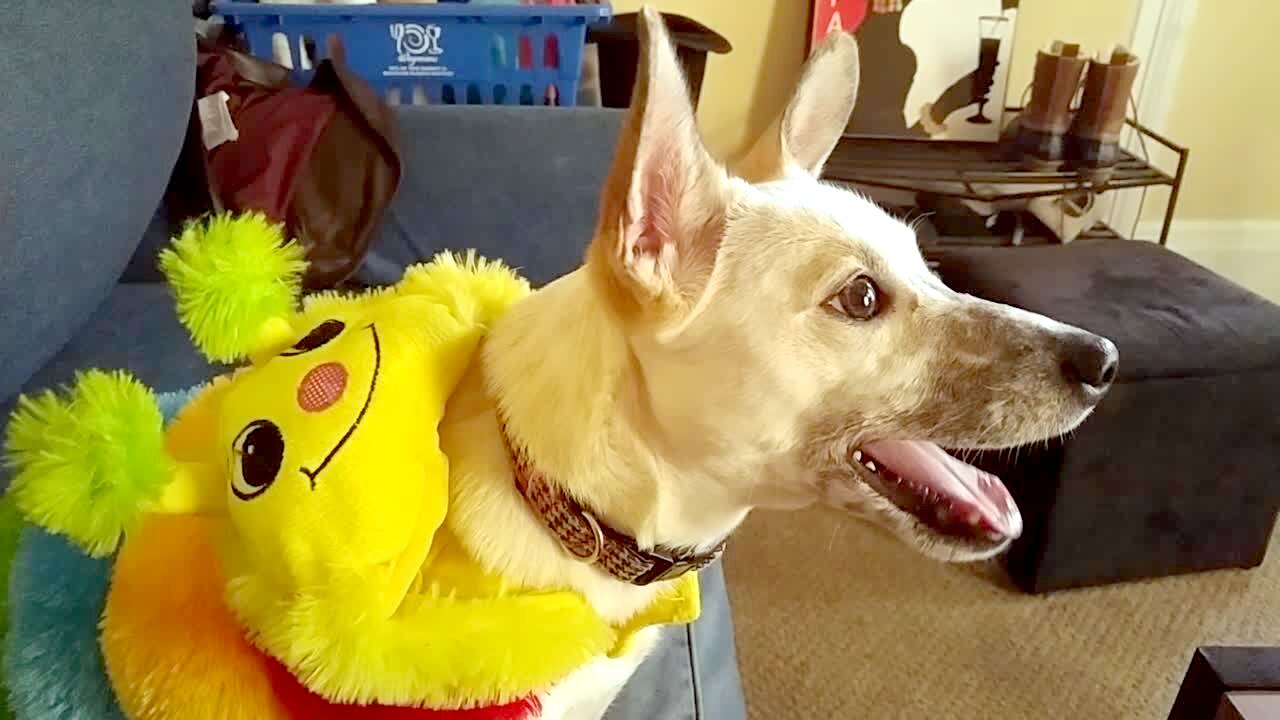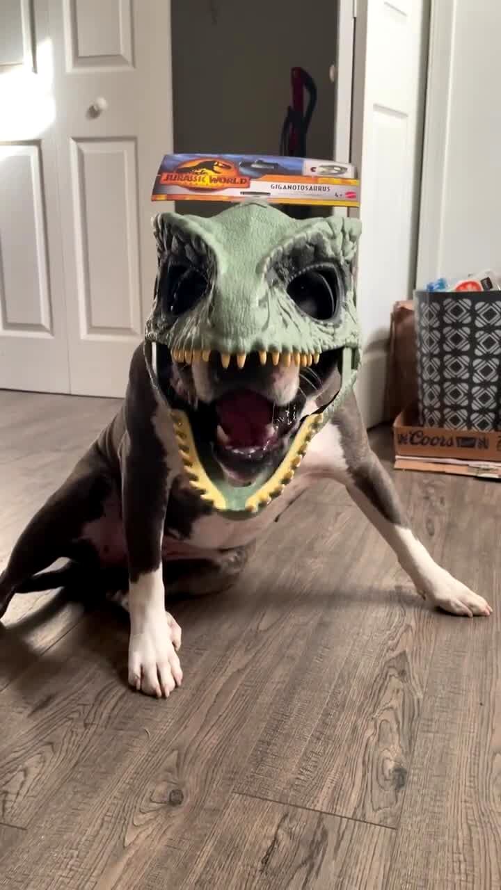 A young girl gives her Golden Retriever dog a piece of bacon as he wears a dinosaur mask in the house, and when the dog chews the mouth of the mask moves.