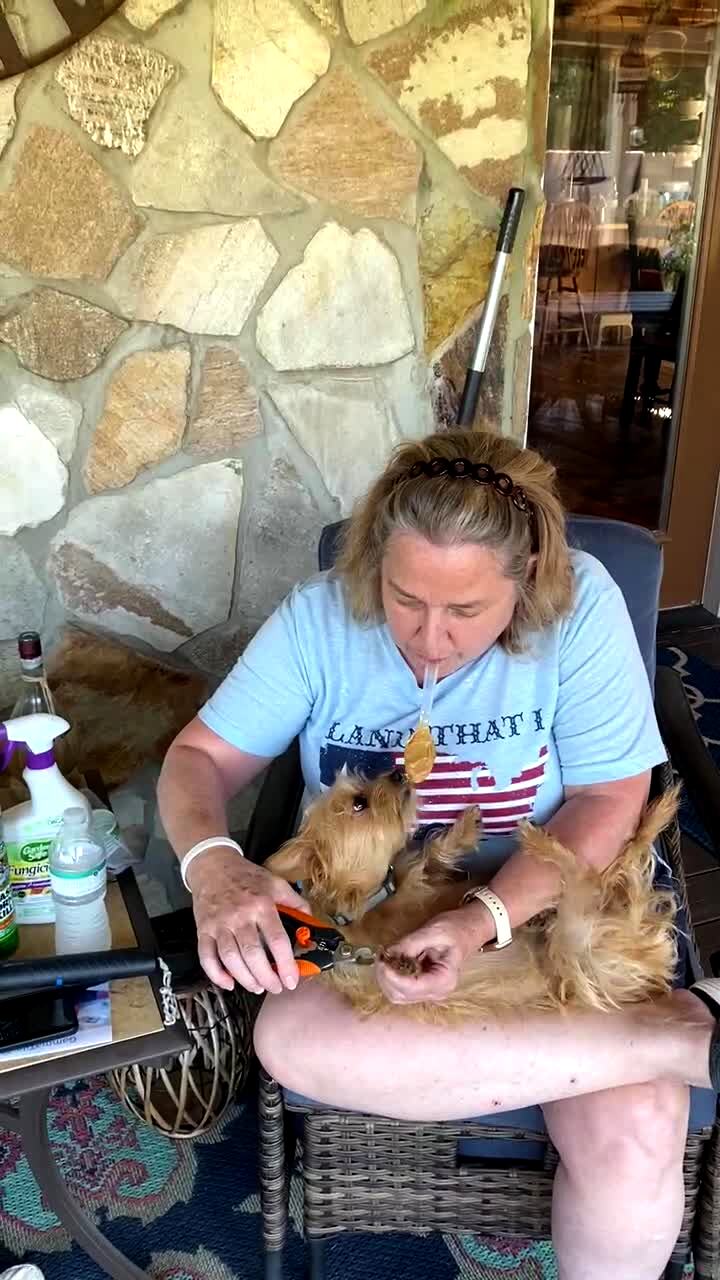 A woman holds a spoon with peanut butter in her mouth as she clips a dog's nails on her lap. The dog licks the peanut butter.