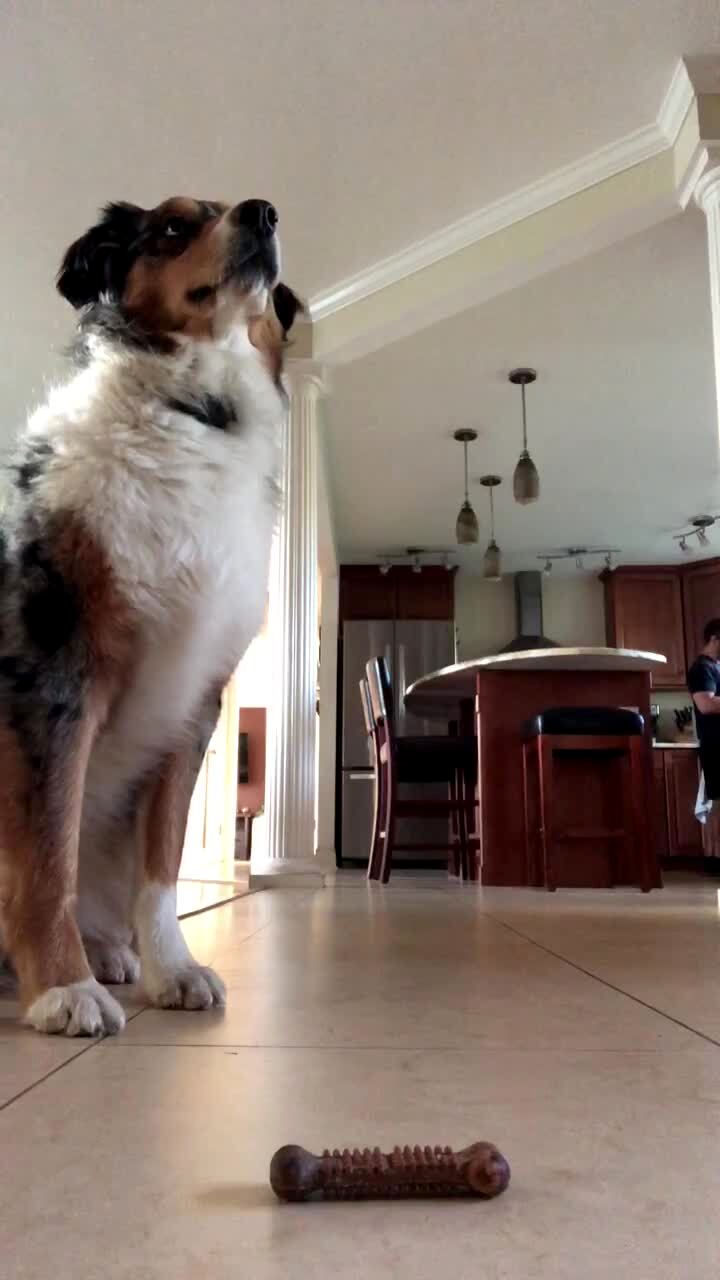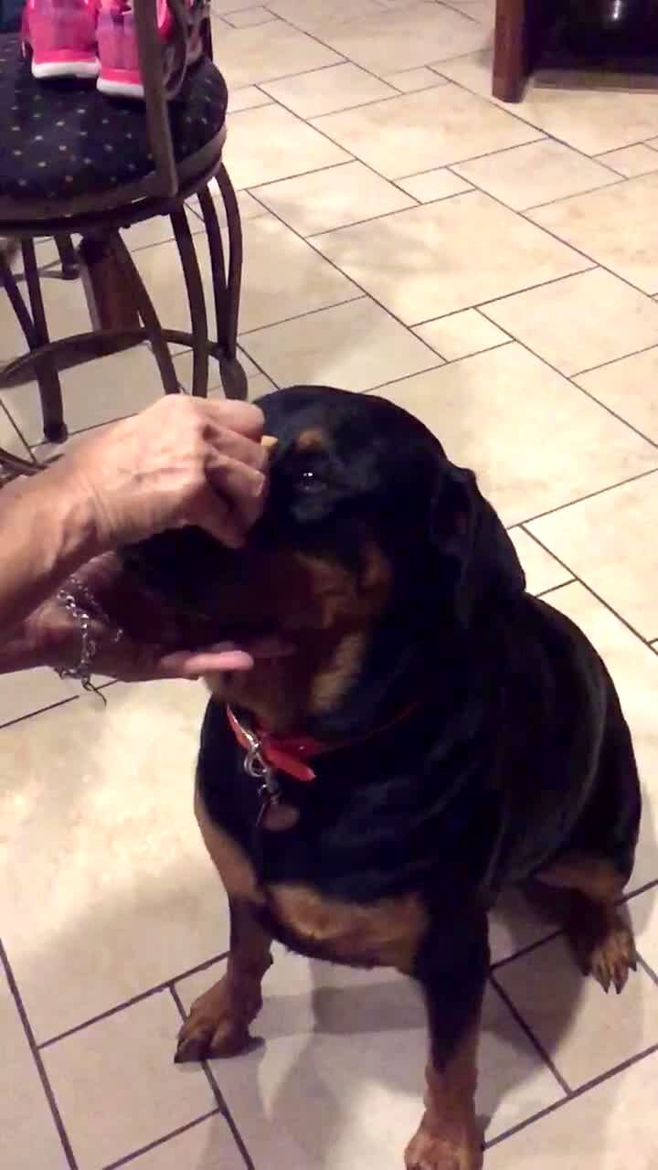 A woman puts a treat on a dog's nose in the kitchen and the dog waits until she gives the command it and it eats the treat in slow motion.
