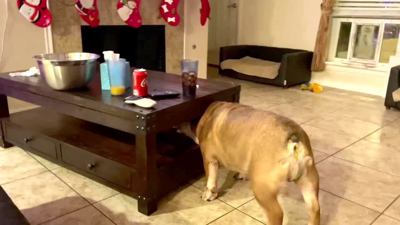 A dog sticks its head into the lower tier of a coffee table to get popcorn, but its head does not fit in the gap. It pushes the table and slides it across the floor.