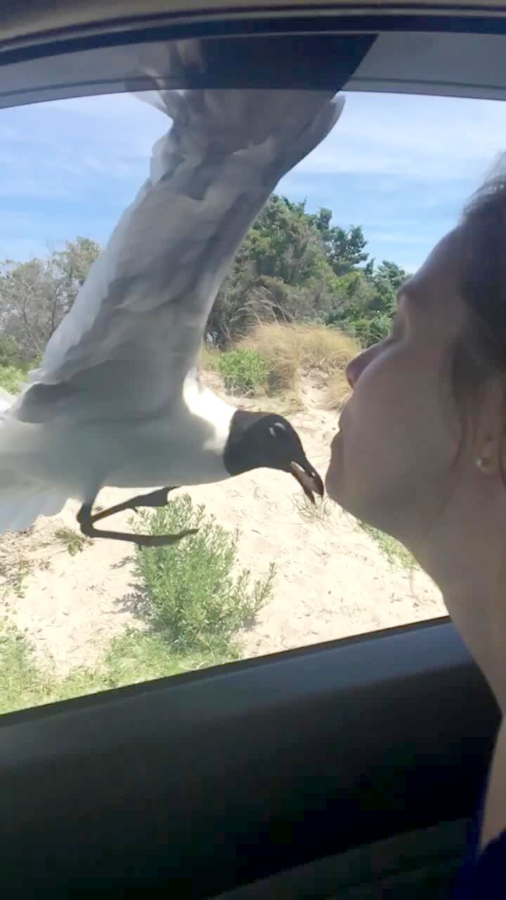 A seagull bird bites a piece of food out of a woman's mouth in slow motion as she sticks her head out of a car window. steal food