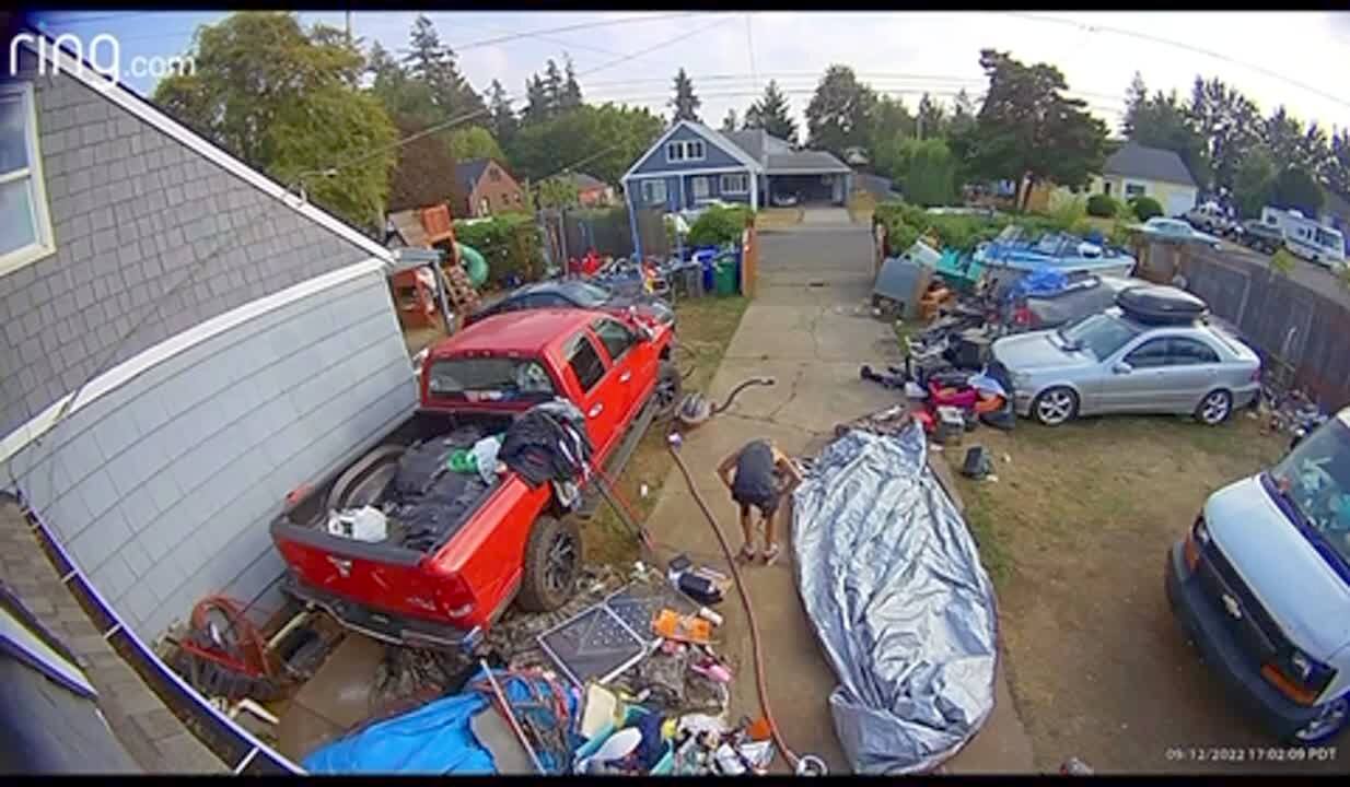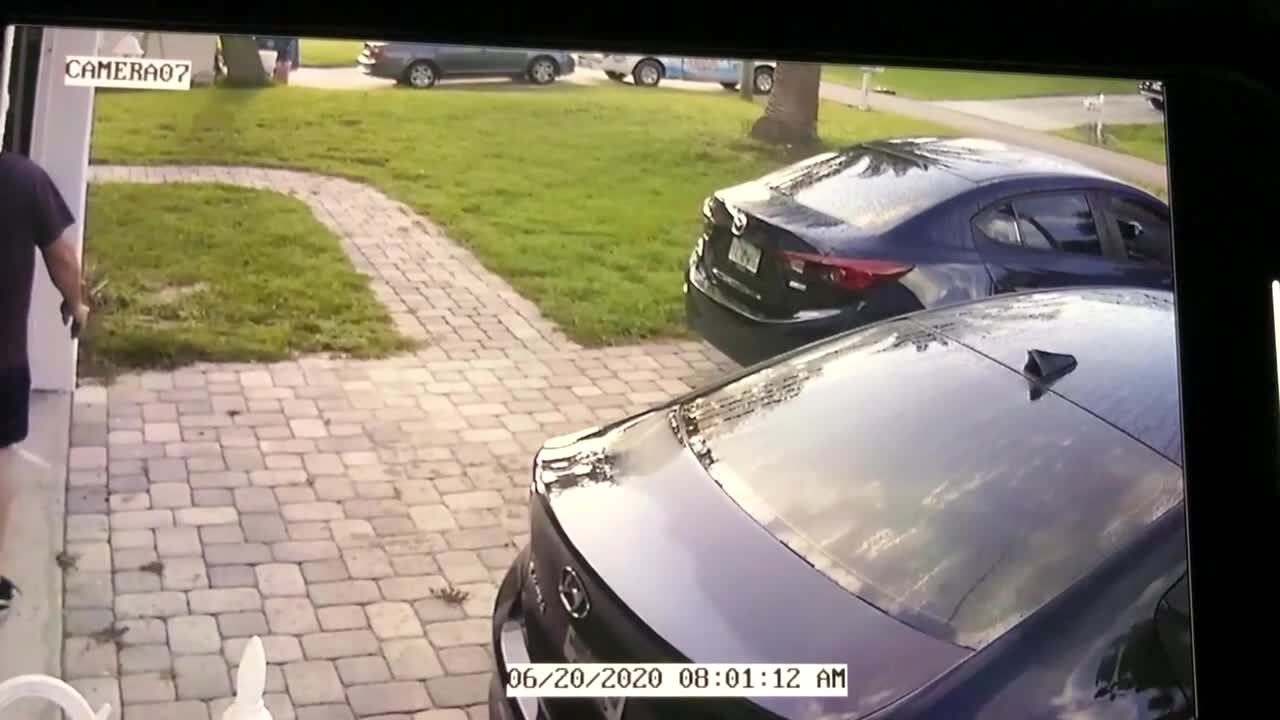 A man removes the front left tire from his car. When the tire is off, the car then rolls back down out of his driveway and into the street, as metal squeals on the pavement. Security footage.