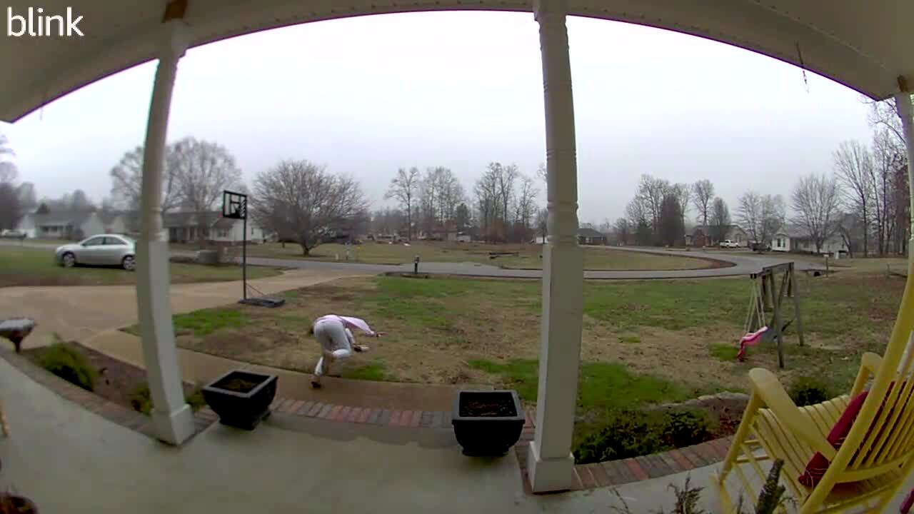 A woman walks down the icy front steps and slips and falls dramatically into the front-yard and lies on the ground and laughs. Security footage.
