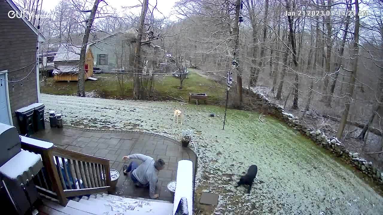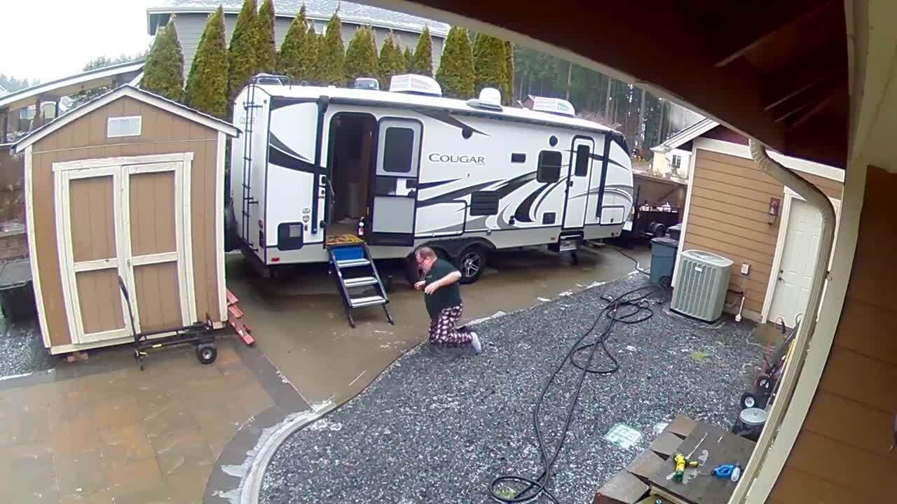 A man slips on some icy camper stairs and falls in a driveway. Security footage.