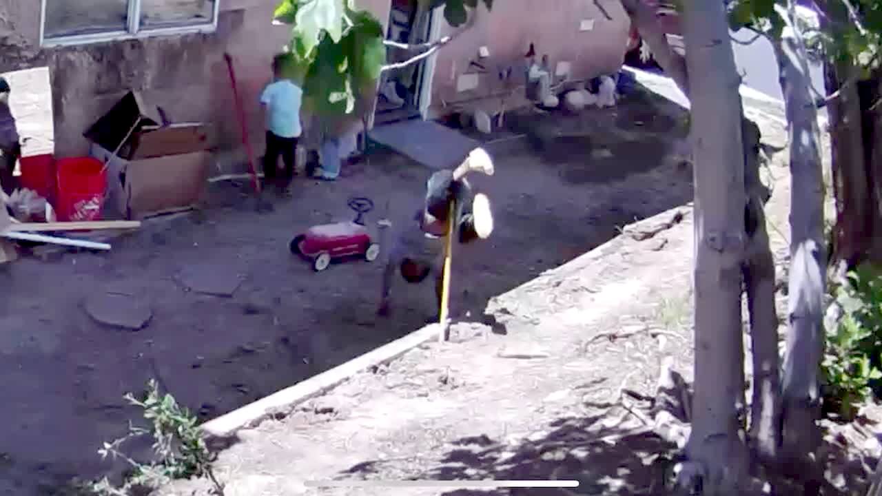 A young boy pushes a crowbar into the ground in a yard and jumps on top of it.Then he gets stuck upside down and yells for help. Security footage.